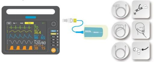 Tiempo de aumento del CO2 | Tiempo de elevación inferior a 80 ms - Adaptador de vías respiratorias reutilizable para adultos o para uso individual de un solo paciente inferior a 80 ms - Reutilizable para bebés o Adaptador de vías respiratorias para uso individual. |